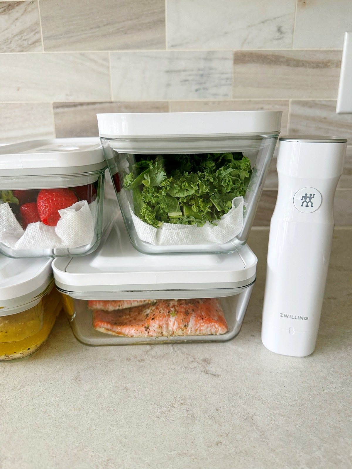 Meal Prep with ZWILLING Fresh & Save Vacuum Seal glass containers! They keep food fresh for up to 5 times longer, they are nestable and stackable for easy storage and made of ovenproof borosilicate glass! Dishwasher, freezer, microwave and oven safe! I use these for meal prep, leftovers, marinating chicken and other meats and they also have Fresh & Save CUBE containers for the pantry! The airtight food-storage system locks in freshness and flavor!