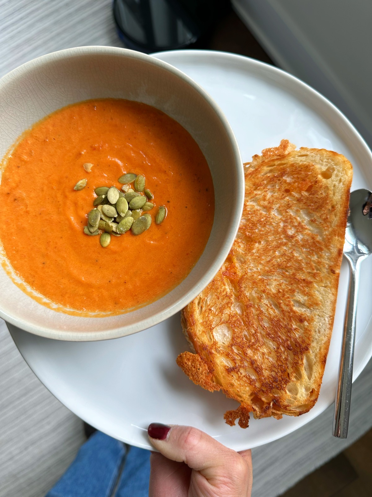 So, after a day of cleaning and lounging around, I got to enjoy a bowl of tomato soup and a grilled cheese sandwich. Classic Tomato Soup. It always hits the spot for me. OK, and I have to ask: are you a dipper? Do you dip your grilled cheese into your soup? A fun way to make this for kids: cut your grilled cheese into spears or sticks. Easy dipping and so good!