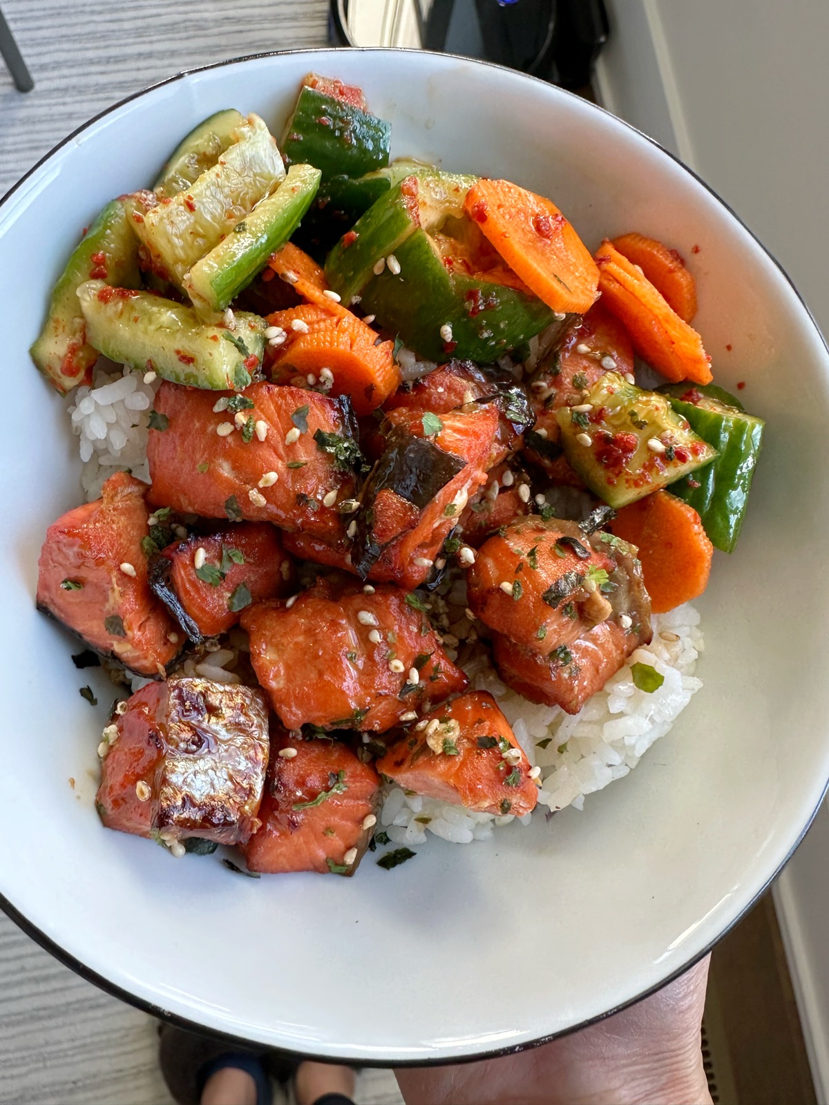- To serve: serve over a bowl of rice (if desired), top with the air fried salmon and add the smashed cucumbers on the side. Lightly drizzle with soy sauce and sesame oil if desired and feel free to sprinkle on a little furikake if desired. Enjoy!