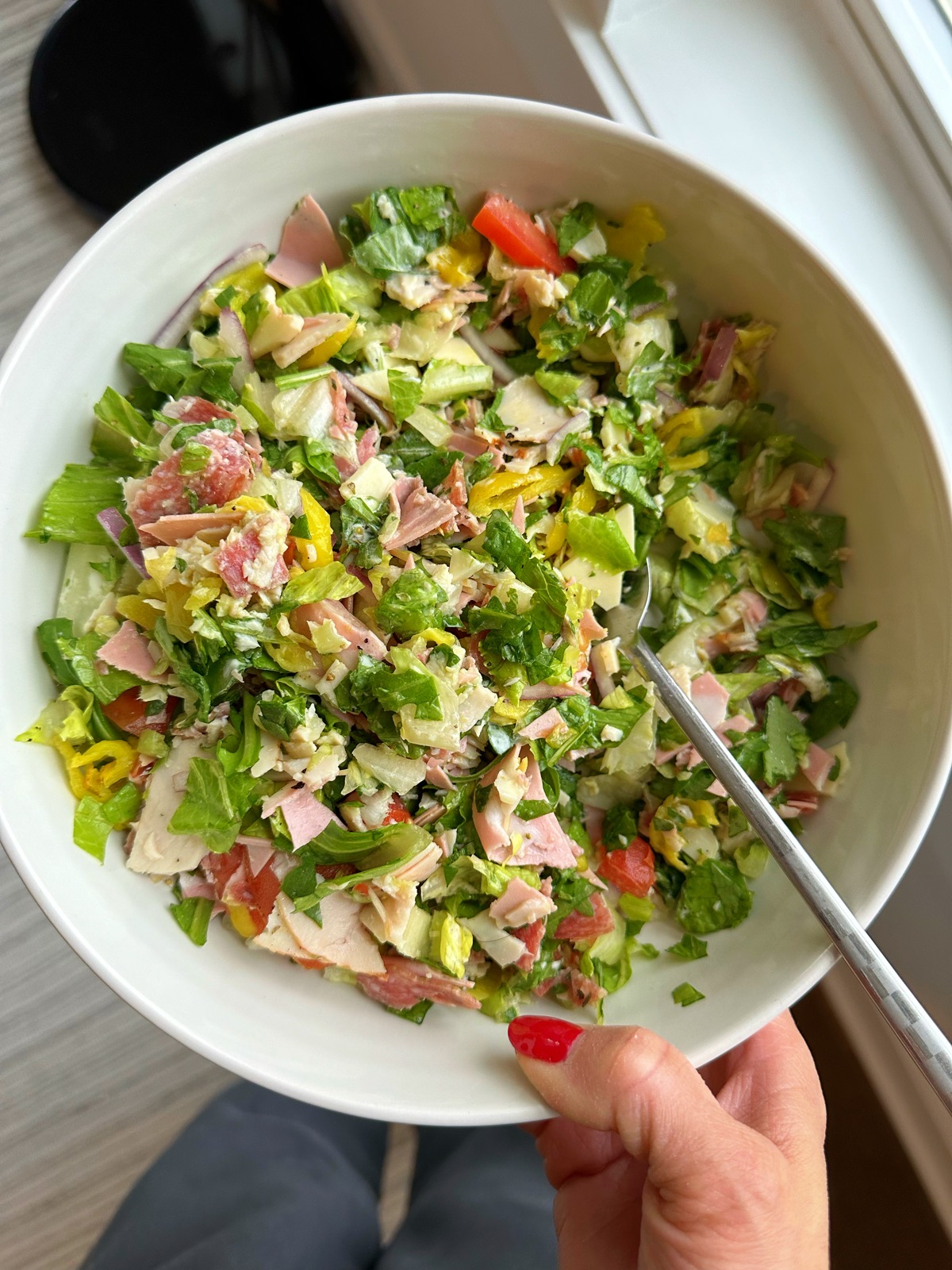 Viral Italian Chopped Salad and Sandwich! This is messy but it’s so delicious! Super quick, filling and so good! Eat this as a salad or sandwich, up to you!
