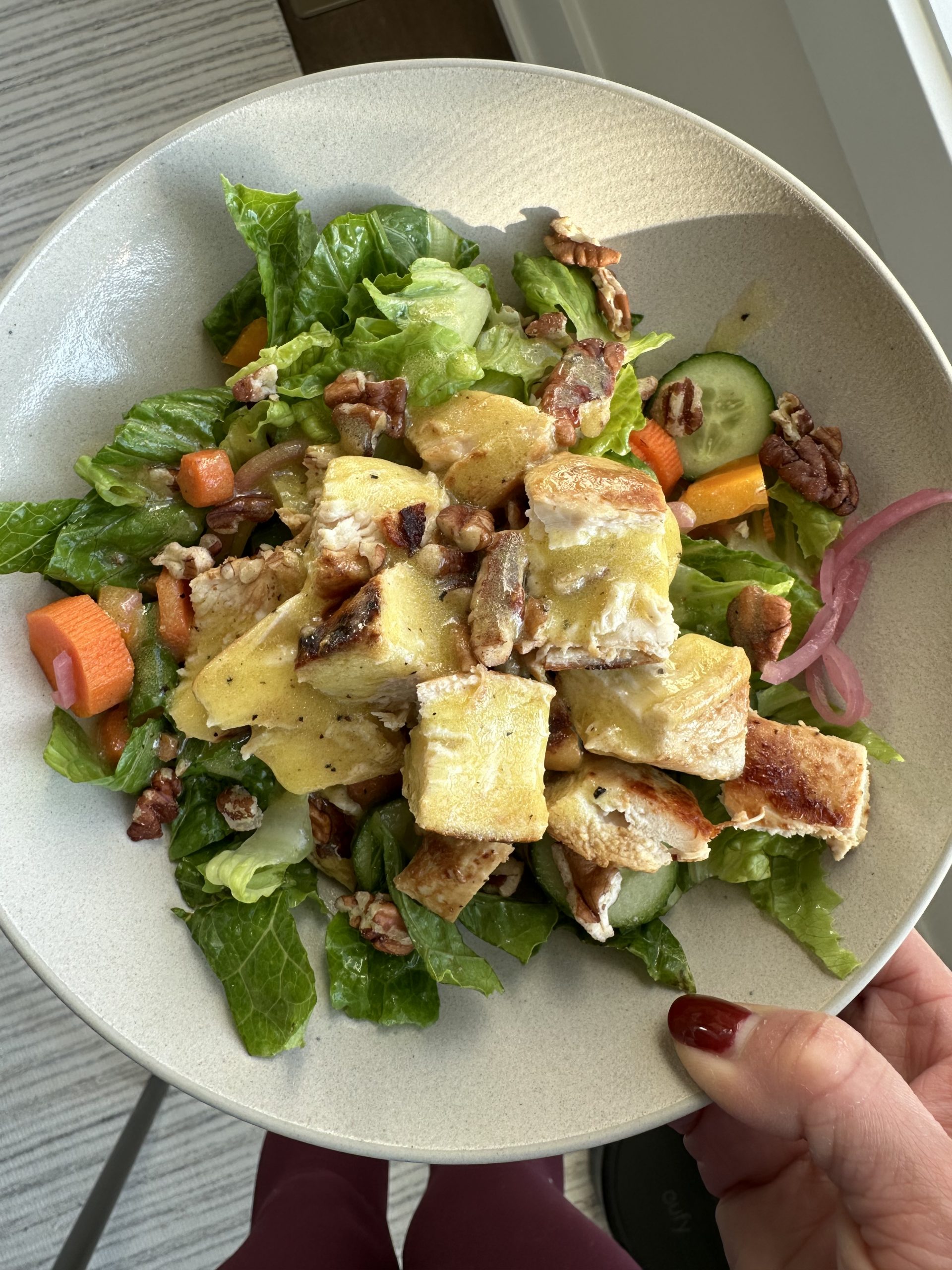Chicken Salad with Dijon Vinaigrette! I’m also sharing my Apricot Vinaigrette dressing below! This is my go-to salad recipe. I make this all the time and change it up based on the vegetables I have on hand. This works with just about any protein and it’s delicious!