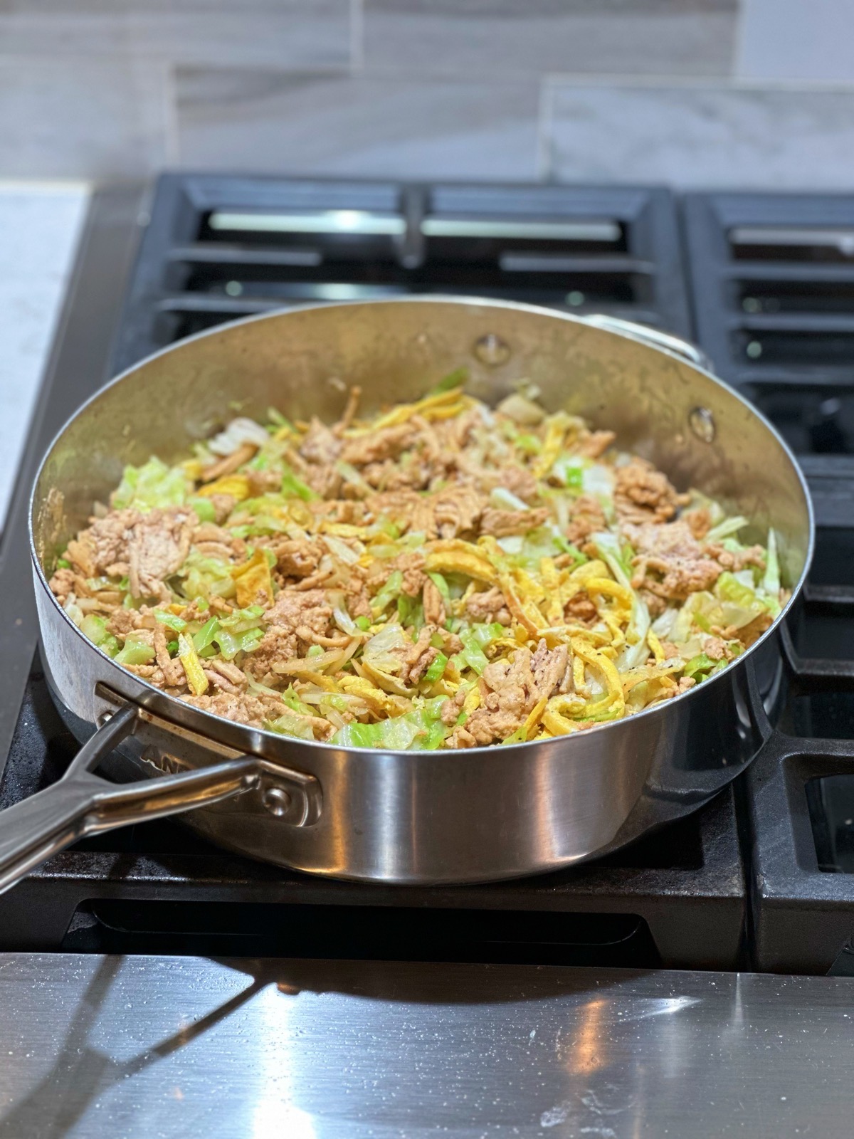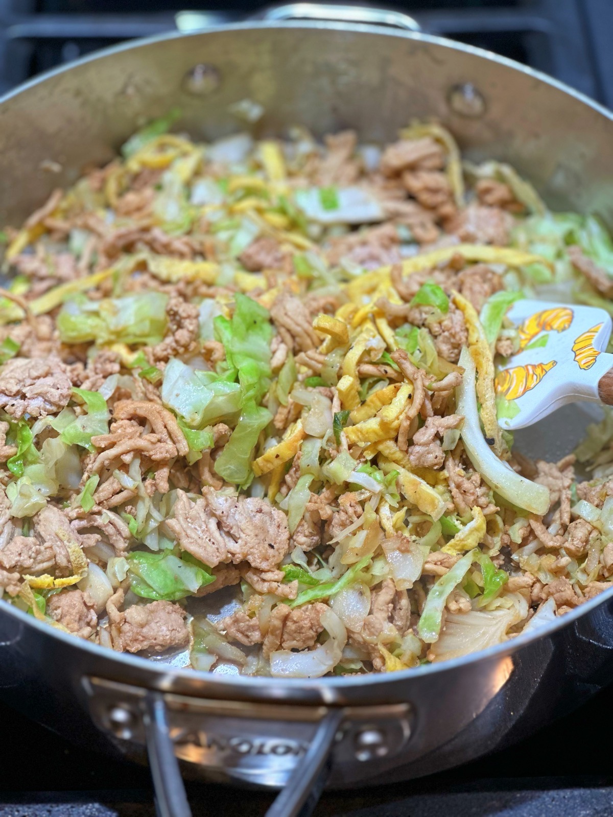 - If wanting to add eggs, you can do 1 of 2 things: 1) add egg ribbons* as a garnish or 2) make a well in the center of the pan or skillet, add the whisked eggs and let cook in the pan or skillet over medium low heat. When cooked, mix into the meat mixture.