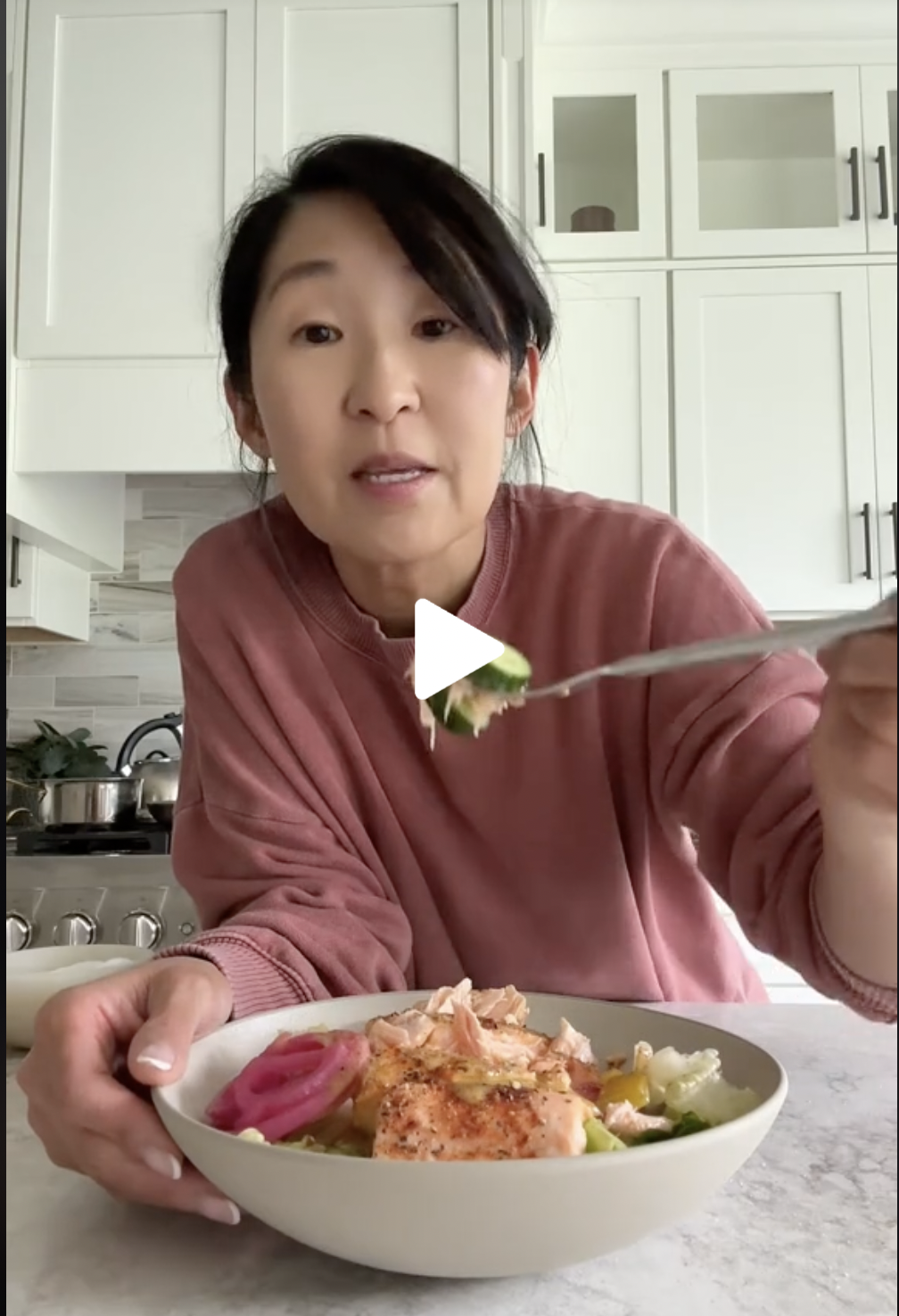 This is simply the salad I make all the time with my baked or air fried salmon. I just throw in whatever I have as far as vegetables are concerned but the pecans or almonds and the pickled red onions are a must for me.