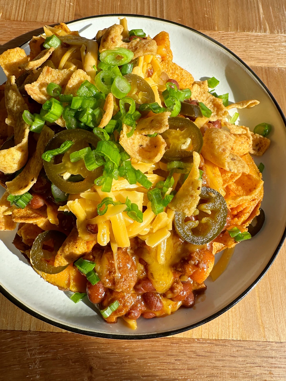 - Cut sweet potato open and add some sour cream. Mash the sour cream into the sweet potato so it melts a little. Add some Fritos, the chili, the cheddar cheese, and garnish with the green onions and the hot and sweet jalapeños. Make your second sweet potato Frito Pie. Enjoy while hot!