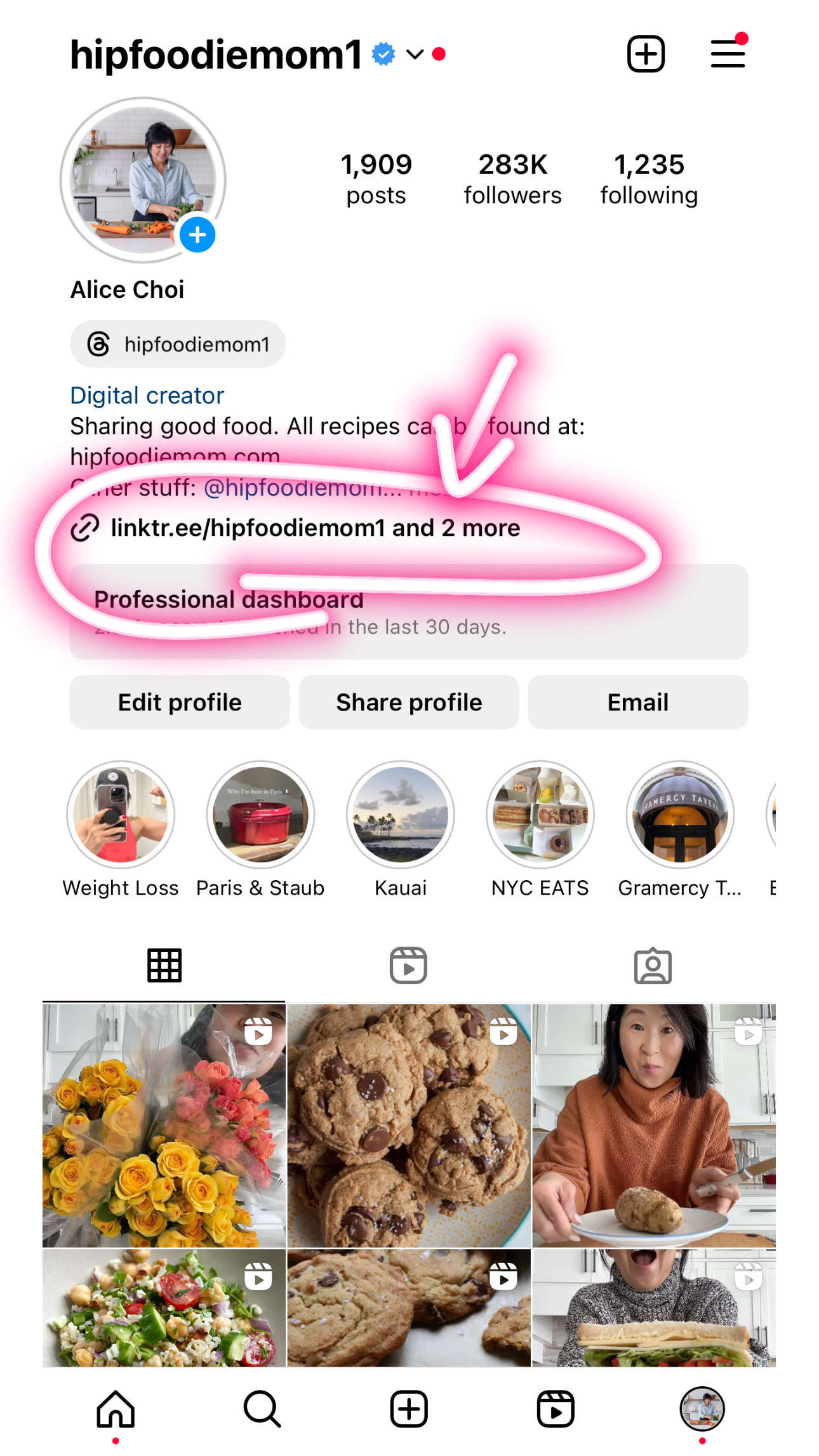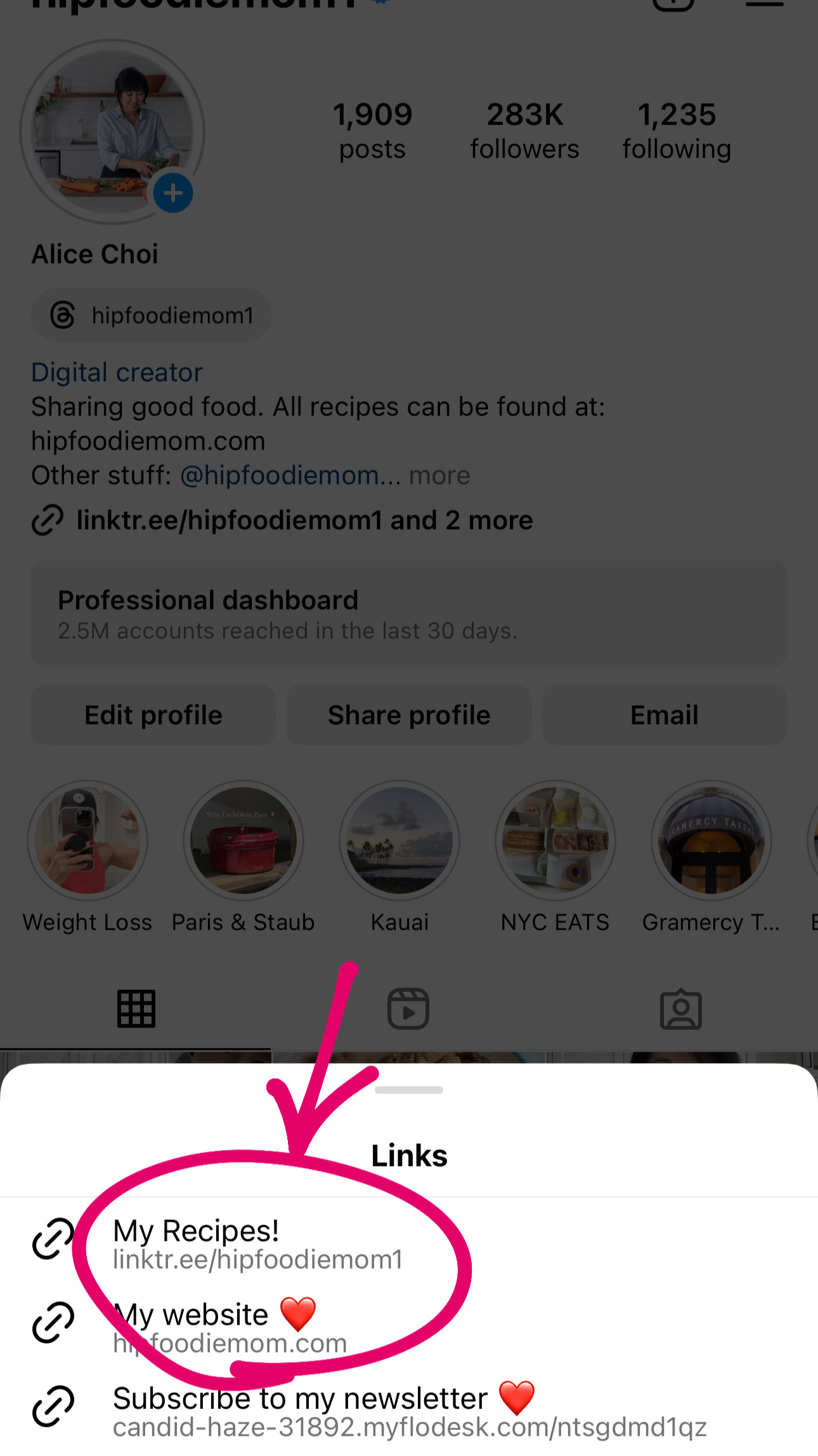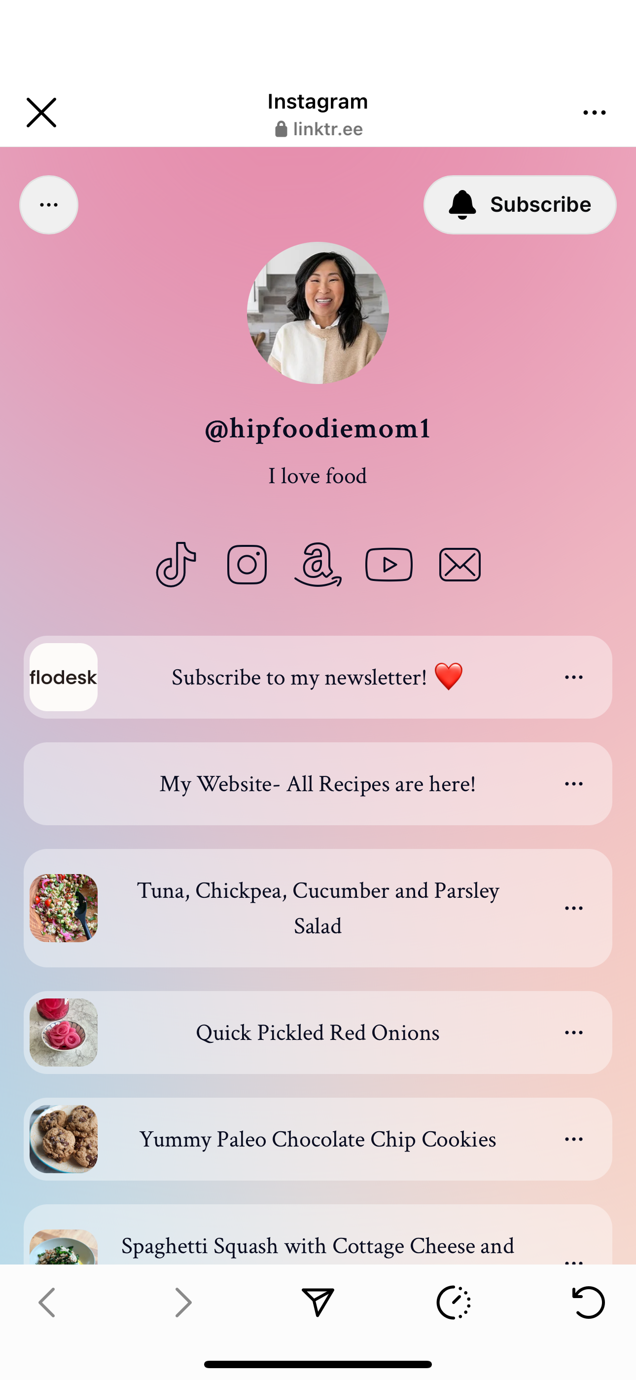 This is my homepage. Here are the clickable links. Instagram allows more than one link. I have 3. You simply tap the linktr.ee link and then it shows you all of my clickable links. From there, tap on “My Recipes!” and it will take you to the last image, there simply find what recipe you are searching for and tap it.