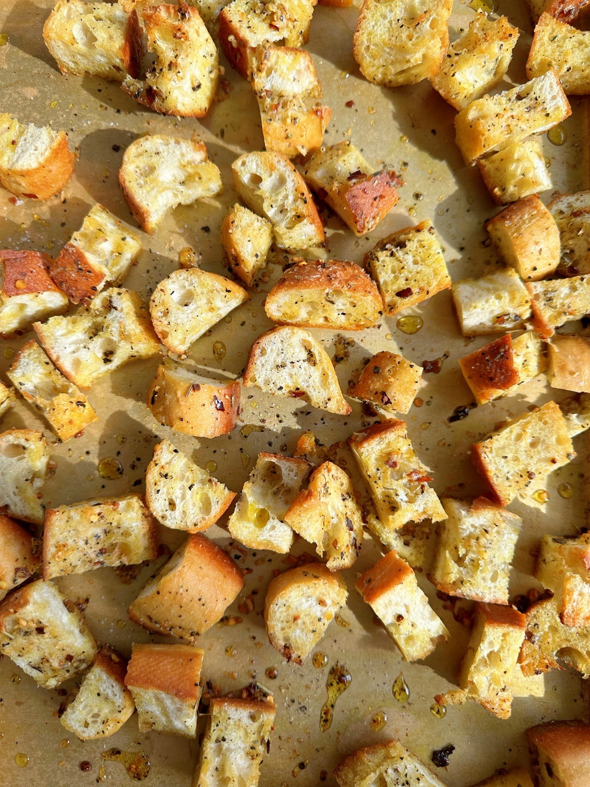 - Preheat your oven to 350 degrees and prep a baking sheet with some parchment paper (if desired). Using a large bowl, mix the bread cubes with the olive oil, garlic, parmesan cheese, crushed red pepper flakes, Italian seasoning and salt and pepper.