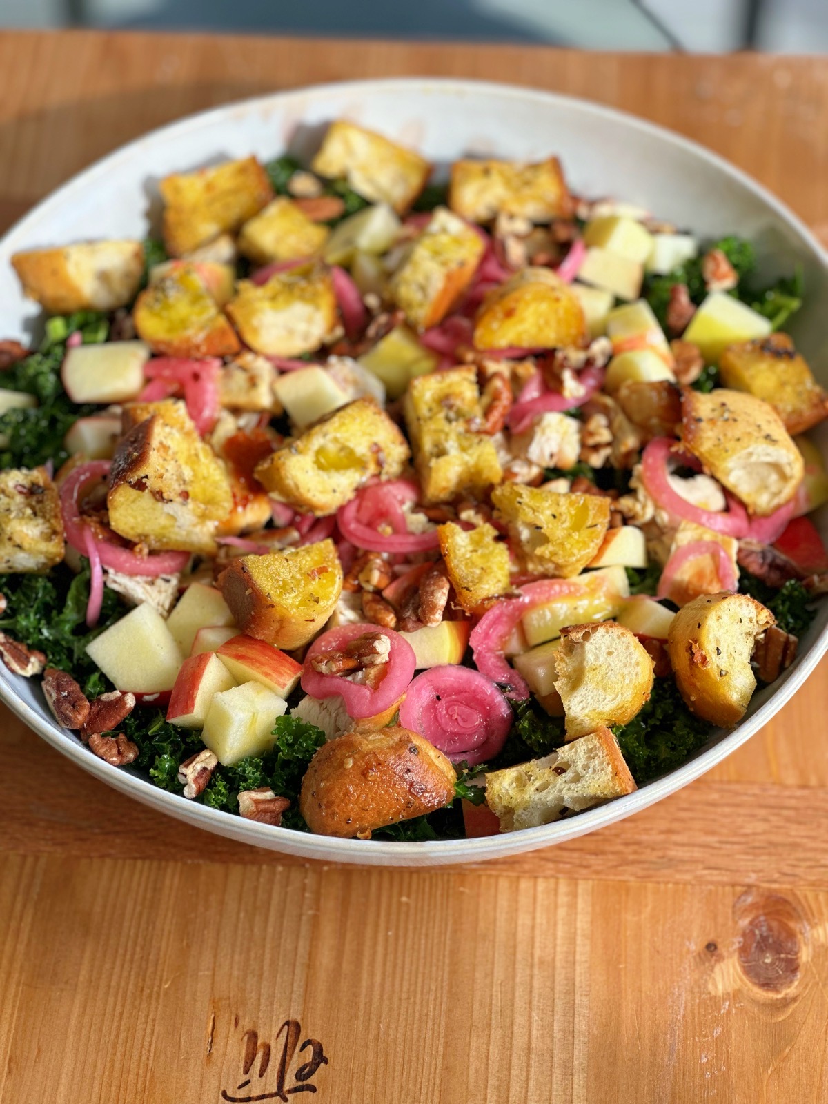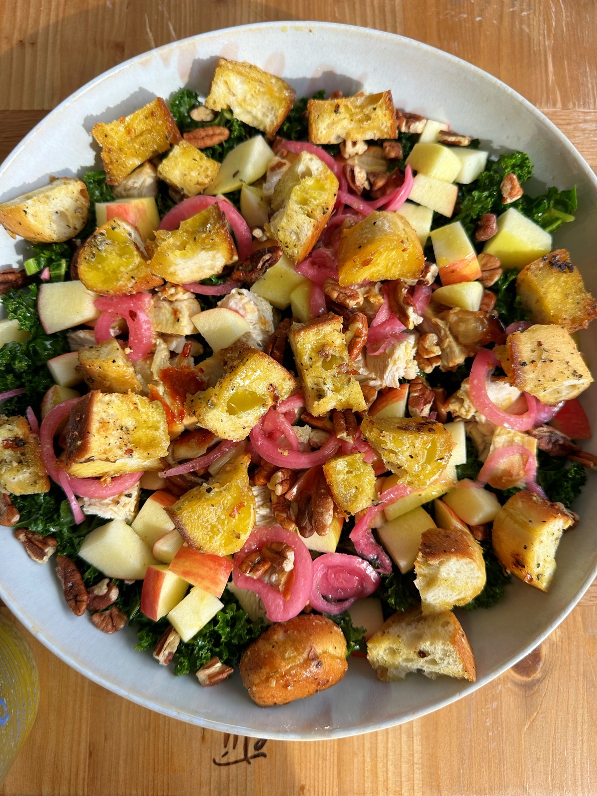 - To assemble: using a large salad plate or platter (or you can just assemble individual bowls if you want), lay in the kale, top with the cooked chicken breast, chopped apple chucks, the pickled red onions, pecans and the bread cubes. Lightly drizzle the Dijon vinaigrette over the top (as little or as much as you want) and toss everything together. Feel free to garnish with some freshly grated Parmesan cheese if desired. Serve and enjoy!