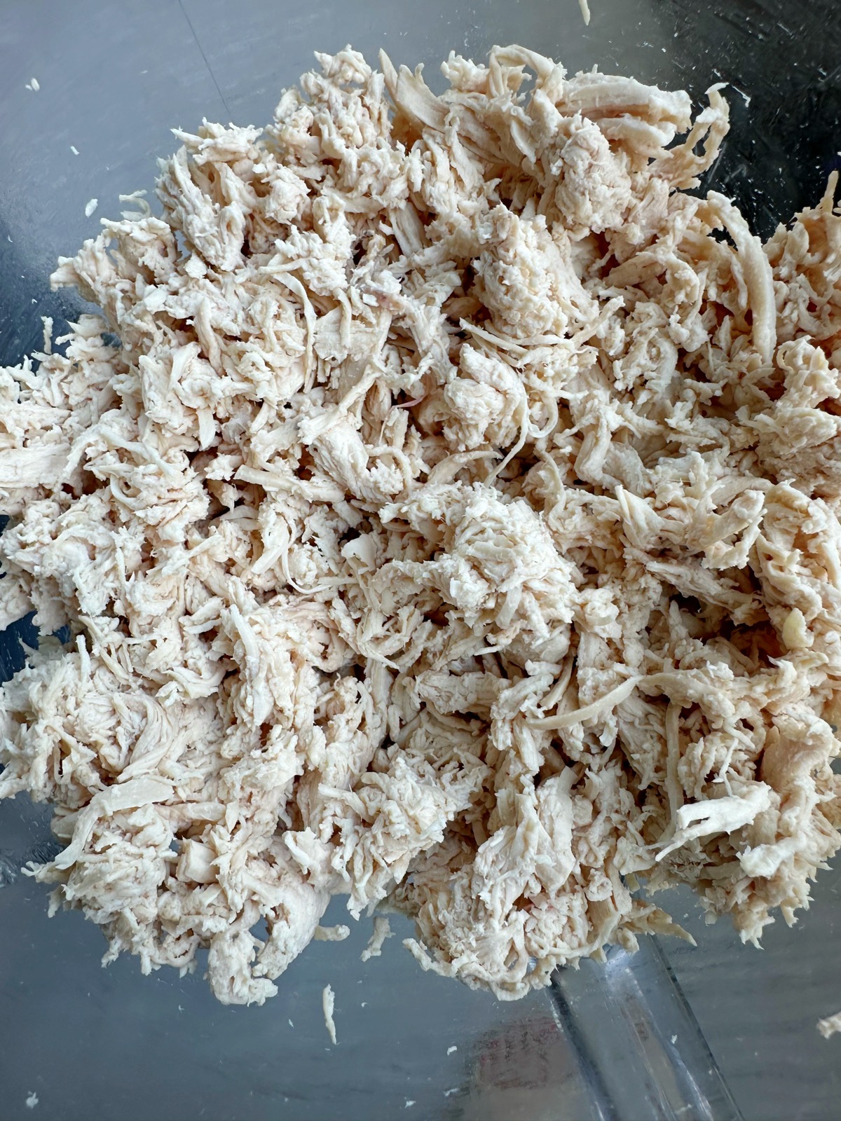- Using your stand mixer fitted with the flat beater attachment, place your cooked chicken into the stand mixer and starting at a low speed, let the mixer go, then slowly increase the speed to high and your chicken should be all shredded up (like the photo above) in about 30 seconds. If you don't have a stand mixer, shred up your chicken using two forks, or simply chop up with a knife. Set aside.
