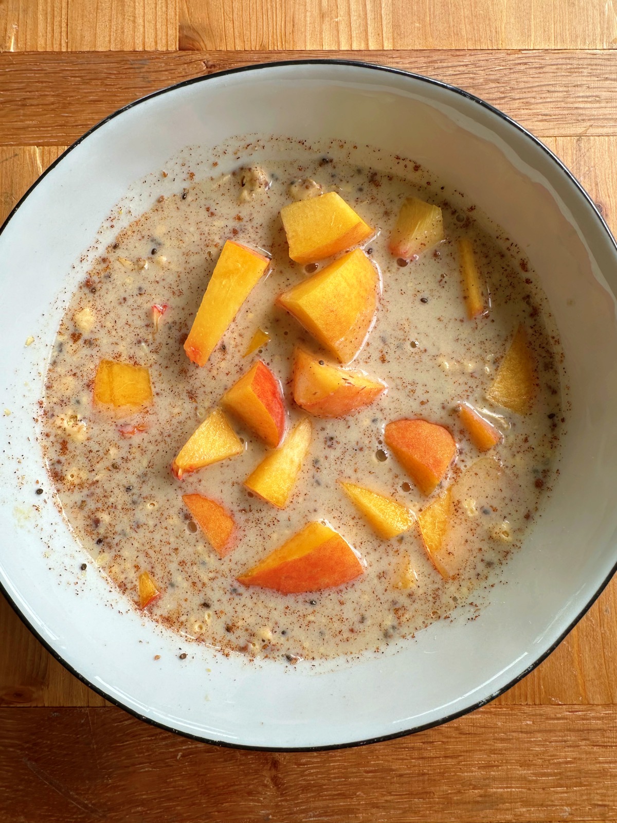 - In your jar, or in a mixing bowl, combine everything from the rolled oats to the maple syrup. Stir to combine. If not already in a jar, transfer to a jar and top with the peaches. Place lid on and refrigerate overnight, or at least for a few hours.