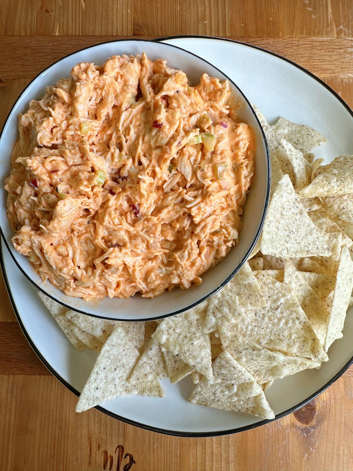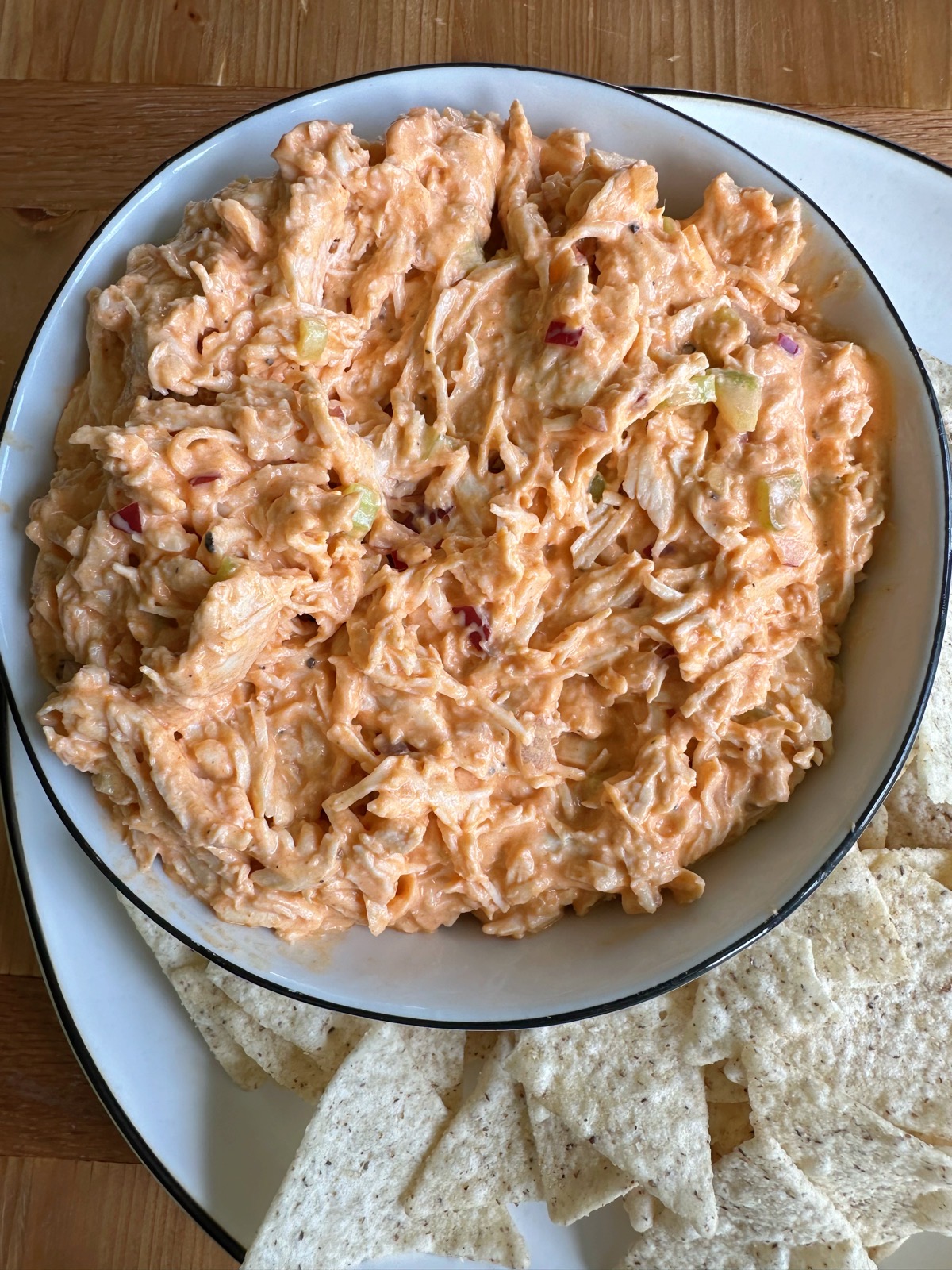 Buffalo Chicken Salad! Creamy, flavorful, delicious and has a kick! Eat this in a sandwich, in a wrap, with crackers, tortilla chips or by the spoonful. It’s good!