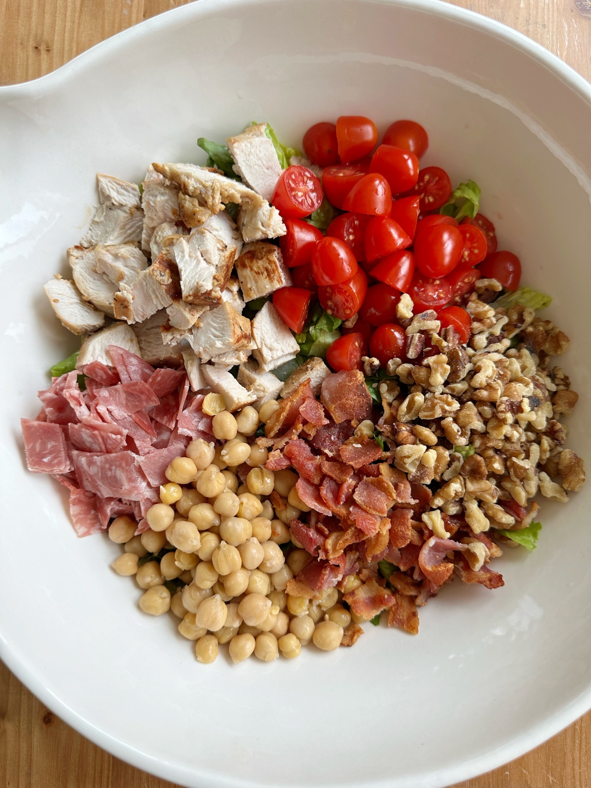 - Using a large mixing bowl, combine the chopped romaine lettuce, tomatoes, garbanzo beans, salami, crispy bacon, chicken, Pecorino, Parmesan or blue cheese crumbles (whatever you are using), pecans and hard boiled eggs (if adding). Mix together, add the dressing, toss together again and serve! Alternatively, you can serve the salad with the dressing at the table. Enjoy!