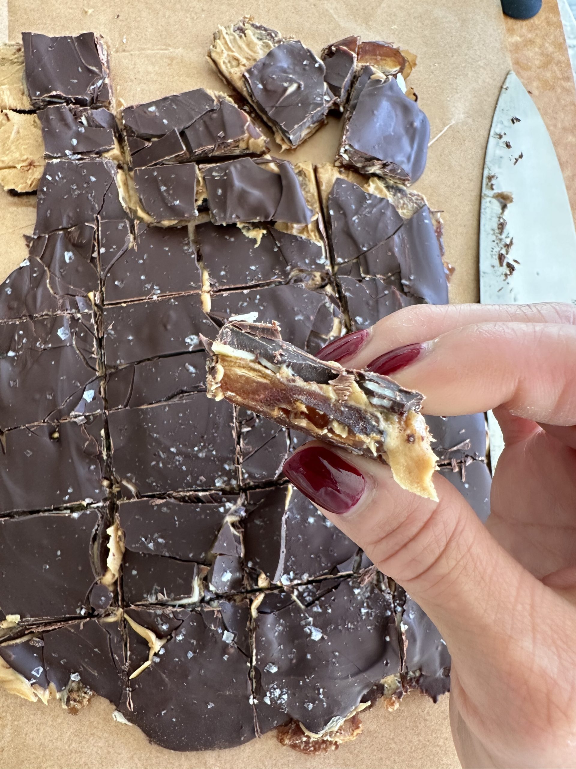 Date Bark is when you flatten and roll out the dates, spread peanut butter or any nut butter on top and top with melted chocolate. Freeze, chop up and enjoy! It’s that simple!