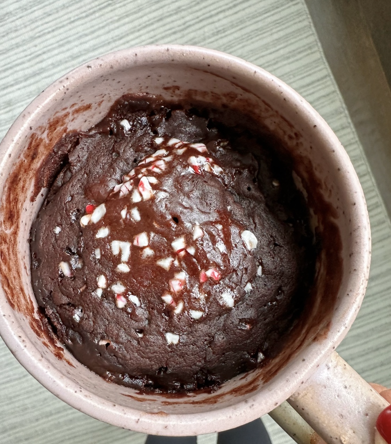 - For the mug cake: Using a medium to large sized mug, whisk together the flour, cocoa powder, sugar, baking powder and salt. Whisk in the avocado oil, milk crushed peppermint candies and pure peppermint extract until well combined. Mix in chocolate chips if desired. Sprinkle more crushed peppermint candies over the top.