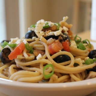 Spaghetti with Tomatoes, Black Olives & Blue Cheese